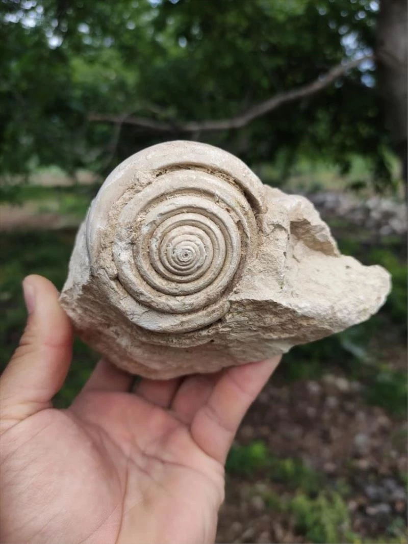 Mersin Bisiklet Derneği Başkanı Süleyman Uygun, kardeşi ve yeğeniyle, Toroslar ilçesinin Arslanköy Yaylası'nda bisiklet sürerken bir kayanın içinde salyangozu andıran fosil buldu.