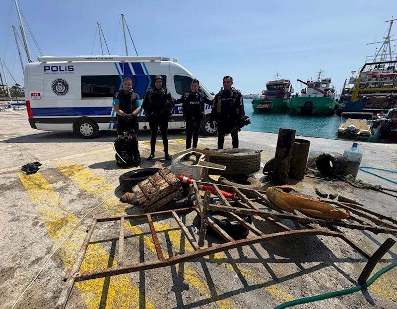 Silifke ilçesindeki Taşucu Limanı'ndan dalış yapan dalgıç polisler, deniz dibinden araç lastiği, cam ve plastik şişe, çöp kovası, sandalye, bariyer, bisiklet, damacana ve çok sayıda çevresel atık topladı.