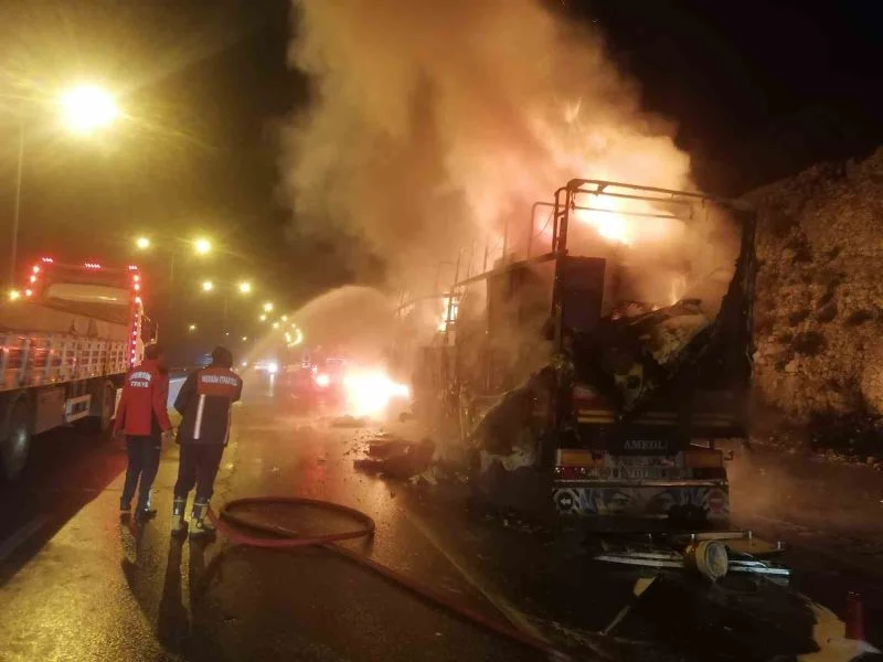 Mersin’de depremzedelerin eşyalarını taşıyan tır alev alev yandı