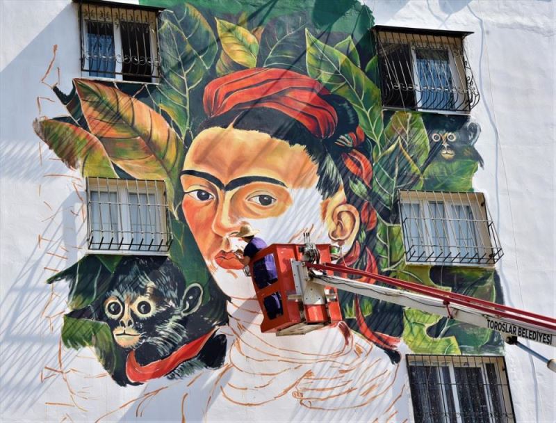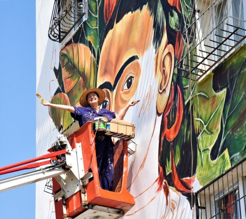 Ressam Nazife Bilgin Hazar, boyalari eskimis bir apartmanin dis cephesinde "reprodüksiyon" islemiyle dünyaca ünlü Ressam Frida Kahlo'nun "Ben ve Maymun" adli eserini resmetmeye basladi.