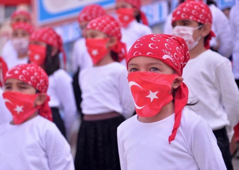 Yenişehir ilçesindeki Piri Reis İlkokulunda düzenlenen etkinlikte öğrenciler, Türk bayrağı motifli maskeler ve bereler taktı.