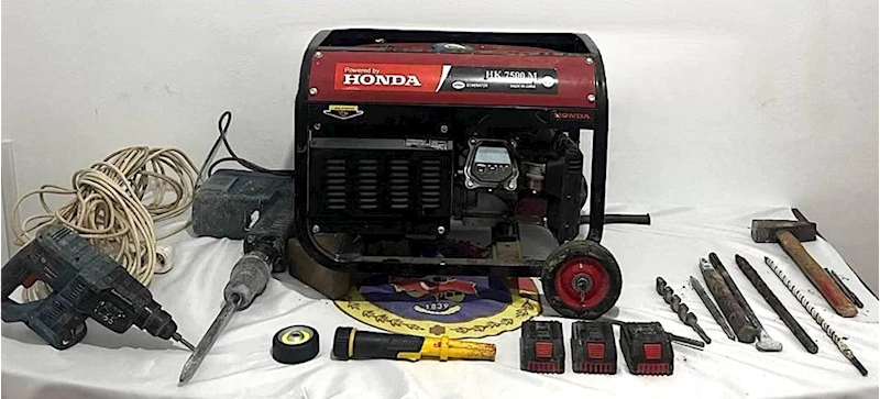 Kazı alanında jeneratör, matkap ve çekiç ele geçirildi.