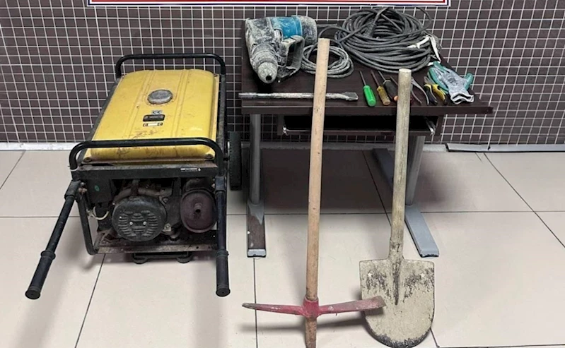 Kazı alanında jeneratör, matkap, kazma, kürek ve çekiç ele geçirildi.