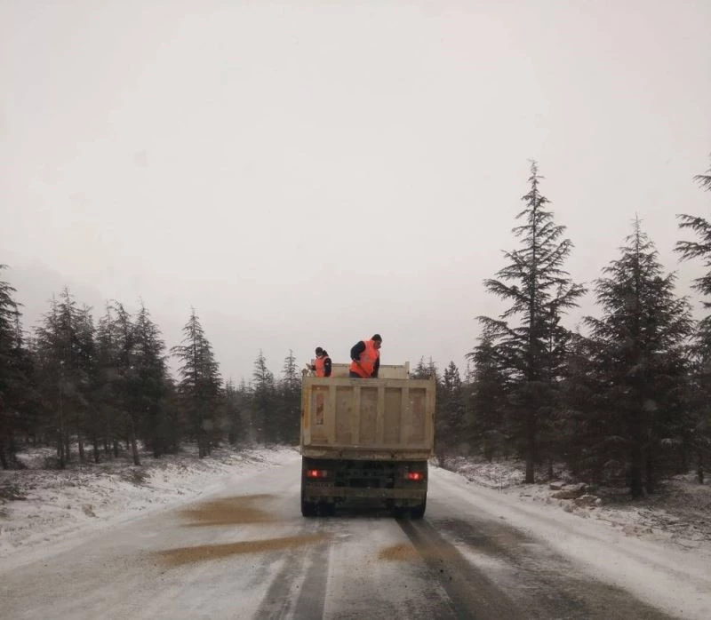 Ulaşımın aksadığı yolda Karayolları ekipleri, küreme ve tuzlama çalışmalarını aralıksız sürdürüyor.