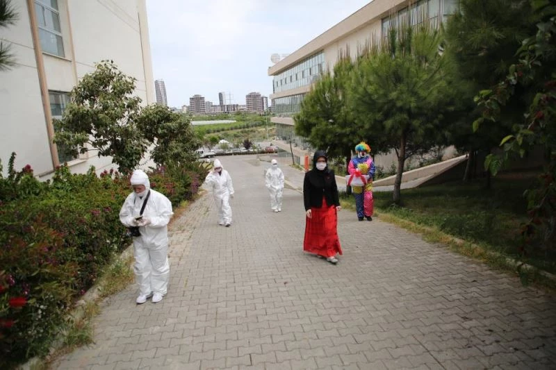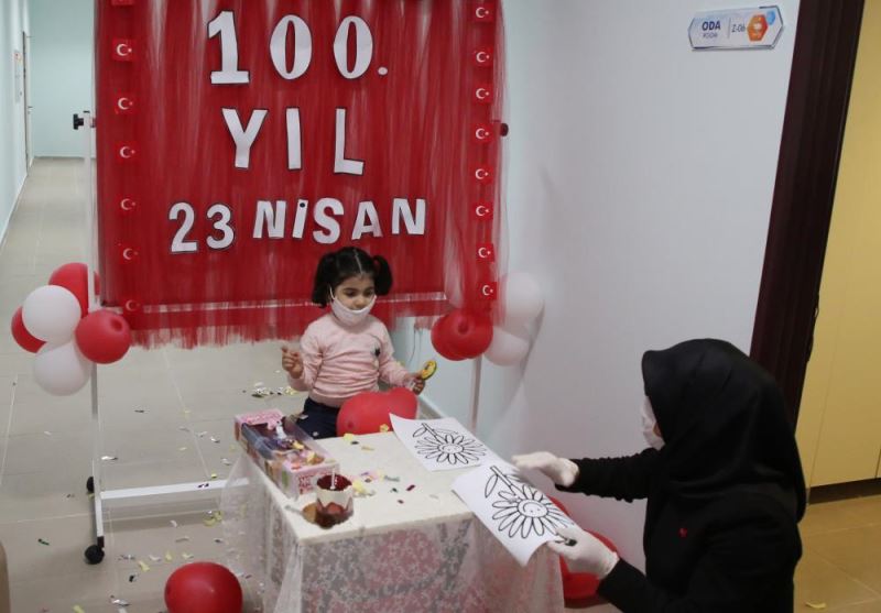 Odalarinda, karantinada kalan çocuklara moral vermek amaciyla düzenlenen etkinlikte, sosyal mesafe kuralina uyularak 23 Nisan kutlamasi yapildi.