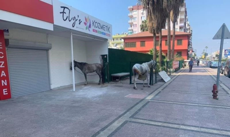 Mersin’de sokağa çıkma kısıtlamasının uygulandığı pazar günü kentin göbeğinde başıboş dolaşan iki at ilginç görüntüler oluşturdu.