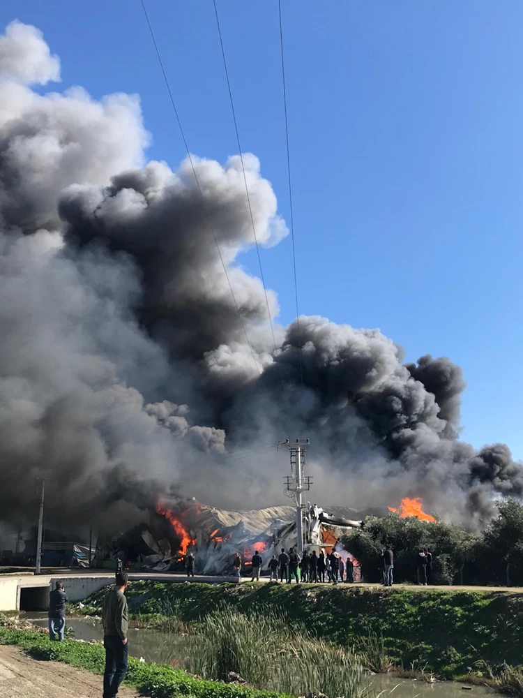 Mersin'de narenciye paketleme fabrikasında çıkan yangına müdahale ediliyor