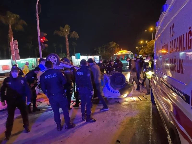 Çarpışmanın etkisiyle ters dönen ekip otosundaki 2 polis memur ile otomobil sürücüsü yaralandı.