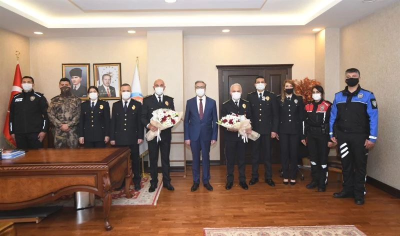 Mersin İl Emniyet Müdürü Mehmet Şahne ile Mersin Şehit Altuğ Verdi Polis Meslek Eğitim Merkezi Müdür Vekili Zafer Ağırkaya, beraberinde müdür yardımcıları ve şube müdürleriyle birlikte Türk Polis Teşkilatının kuruluşunun 176. yıldönümü dolayısıyla Vali Ali İhsan Su’yu ziyaret etti.