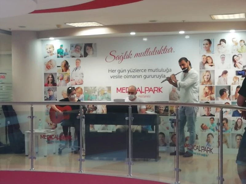 Hastanenin giriş katında verilen konserde gruba hasta ve hasta yakınları eşlik ederek sağlık çalışanlarını alkışladı.