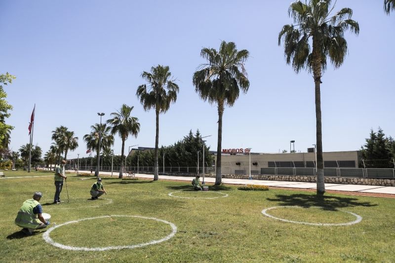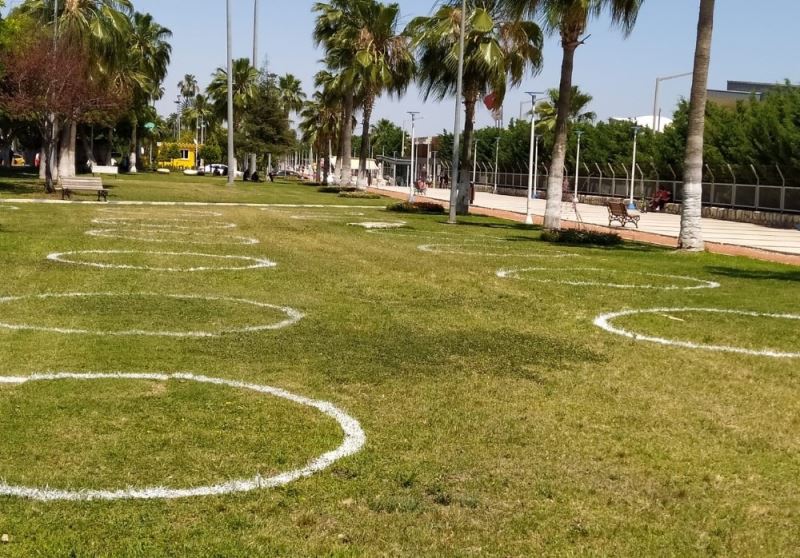 Mersin’de korona virüs tedbirleri kapsamında, sahil bandındaki parklarda sosyal mesafe çemberleri oluşturuldu.