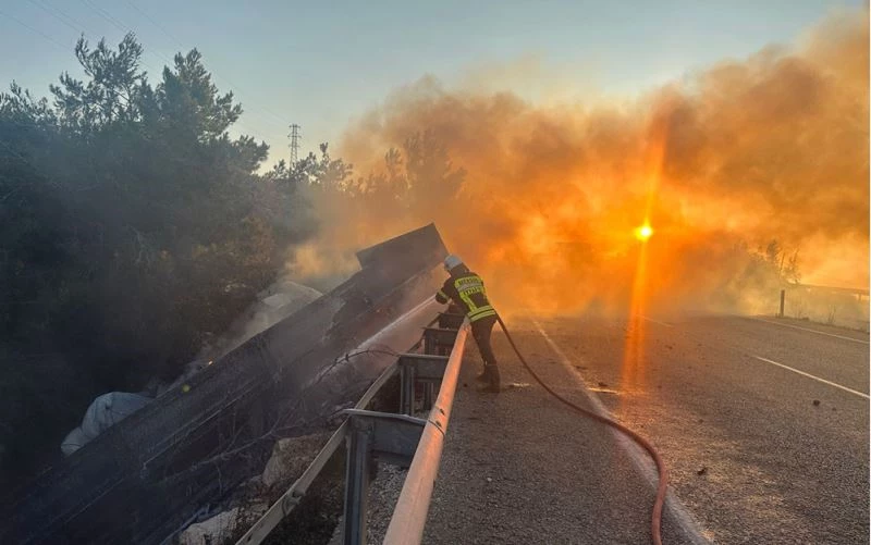 Şarampole devrilen tırın alev aldığını fark eden sürücü, kendi imkanlarıyla araçtan çıkarak durumu yetkililere bildirdi.