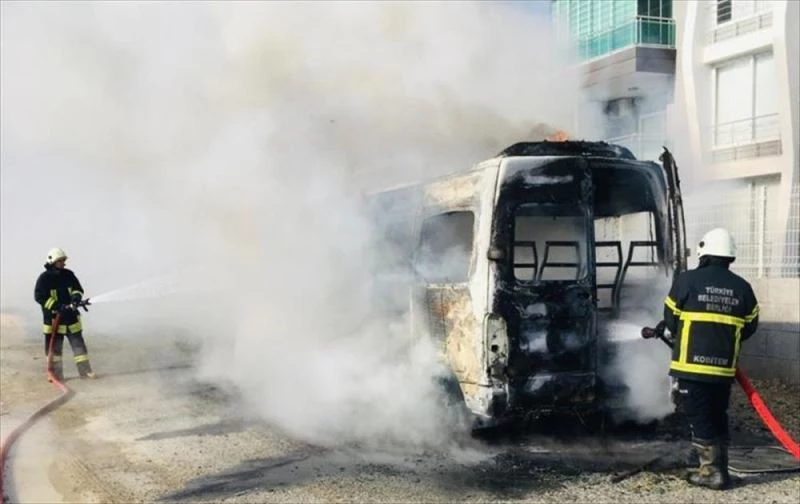 M.Ç. idaresindeki 33 S 5416 plakalı özel bir şirkete ait servis minibüsü, Kırklarsırtı Mahallesi'nde seyir halindeyken henüz belirlenemeyen nedenle alev aldı.