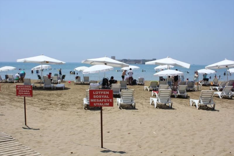 Kovid-19 önlemleri kapsaminda, sezlonglar arasi sosyal mesafe kurali getirilen Erdemli ilçesindeki Kizkalesi plaji, tatil gününü denizde geçirmek isteyen vatandaslari agirladi.