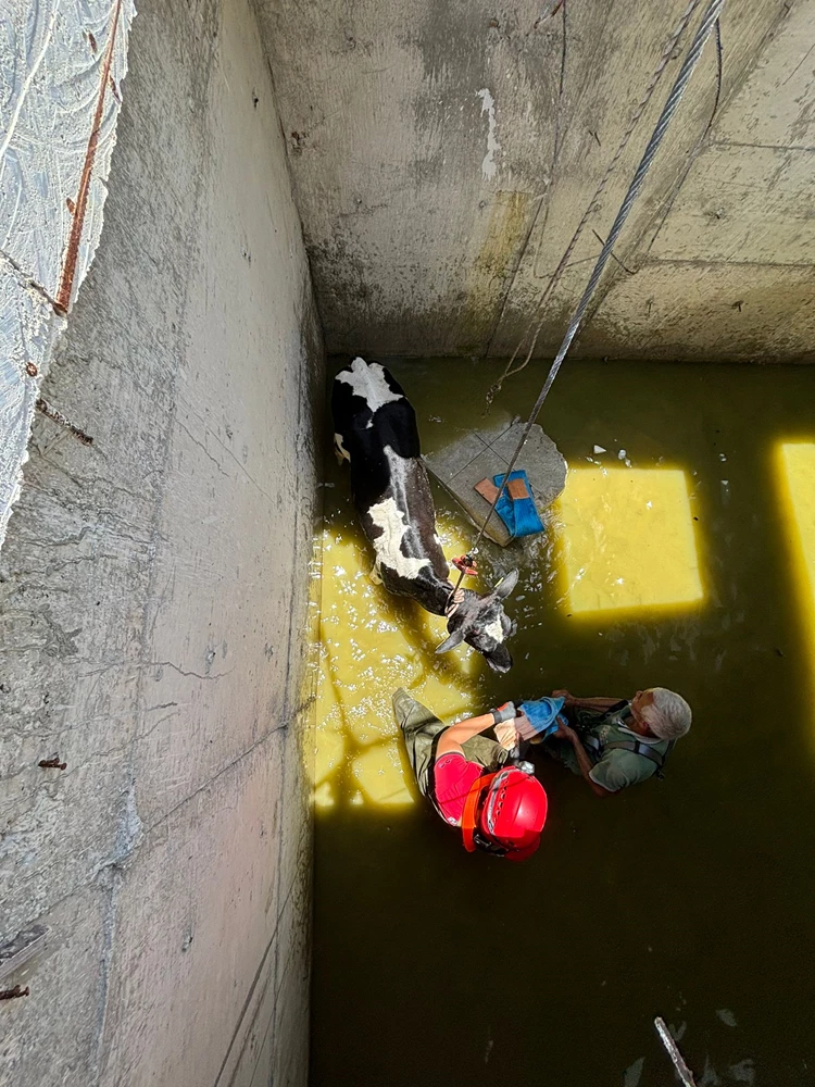 Çiftlik çalışanları, kendi imkanlarıyla inekleri çıkartamayınca itfaiye ekiplerinden yardım istedi. Bölgeye gelen ekipler, kurdukları halat sistemiyle hayvanları bulunduğu yerden çıkardı.
