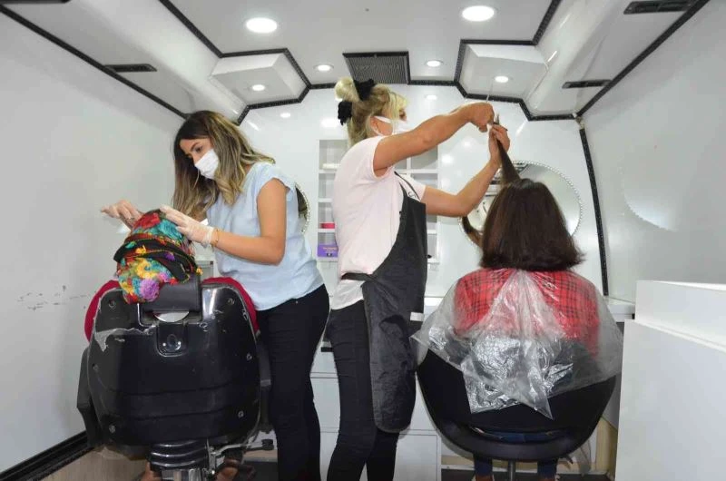 Mersin Büyükşehir Belediyesinin beğeni toplayan projeleri arasında yer alan ve ’Yar saçların lüle lüle’ sloganıyla yol alan ’mobil kuaför’ aracı, birçok noktada vatandaşlara hizmet vermeyi sürdürüyor.
