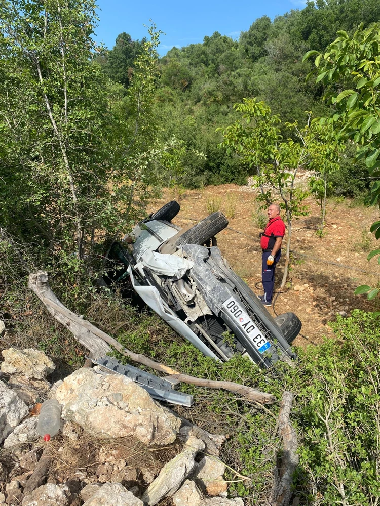 Savrulan araç, yolun yaklaşık 20 metre altındaki uçuruma devrildi.