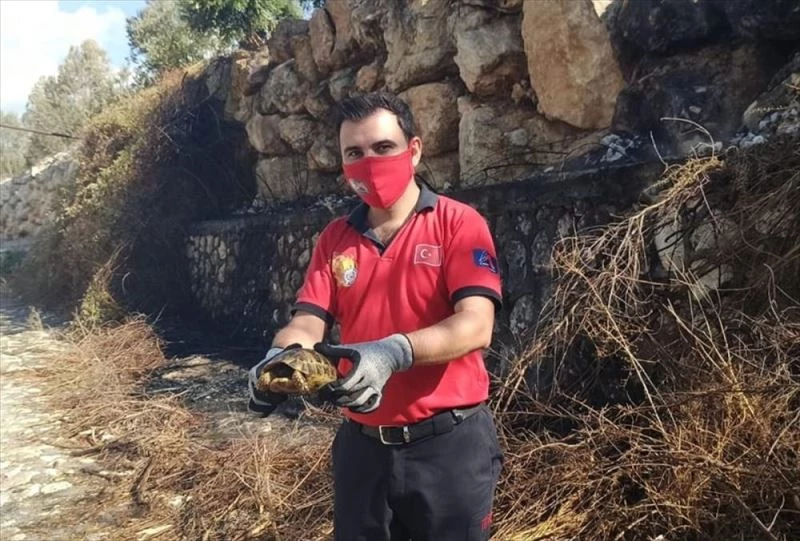 MERSIN (AA) - Mersin'in Erdemli ilçesindeki çalilik yangininda alevlerin arasinda kalan kaplumbagayi itfaiye eri kurtardi.