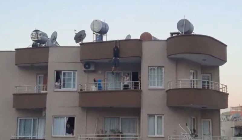 Mersin’de henüz bilinmeyen bir nedenle 5 katlı binanın çatısına çıkan bir şahıs, bir süre asılı kaldığı binanın çatısından 5. katın balkonuna düşerek kurtuldu. Olay anı bir vatandaşın cep telefonu kamerasıyla saniye saniye kaydedilerek sosyal medyada yayınlandı.