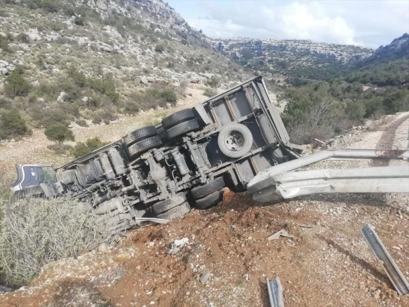 O.A. idaresindeki 33 EJD 18 plakalı kamyon, Gökbelen Mahallesi'nde sürücüsünün direksiyon hakimiyetini kaybetmesi üzerine bariyerlere çarparak devrildi.