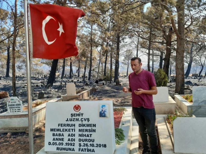 MERSİN - Mersin'in Silifke ilçesinde dün çıkan orman yangınında hasar oluşan mezarlıkta, Tunceli'de 2018 yılında şehit olan Jandarma Uzman Çavuş Ferruh Dikmen'in kabri ve Türk bayrağının zarar görmemesi dikkati çekti.
