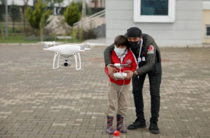 Sivil Havacılık Genel Müdürlüğünce hazırlanan drone kullanımına ilişkin videoların izletildiği 50 çocuk, İHA pilotu Erdal Sağlam'ın verdiği teorik eğitimlerin ardından uygulamalı olarak drone uçurdu.