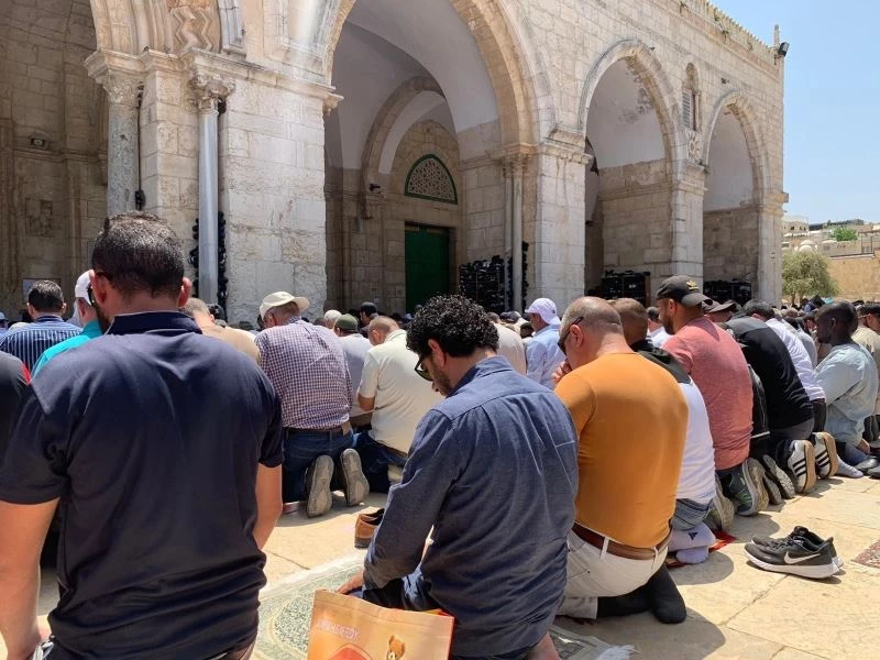 İsrail güçleri ile Filistinliler arasında son günlerde yaşanan yüksek tansiyon devam ederken, binlerce Filistinli cuma namazı için Mescid-i Aksa’ya akın etti. İsrail’in tüm kısıtlamalarına rağmen Ramazan ayının üçüncü cumasında namaza 60 bin kişi katıldı.