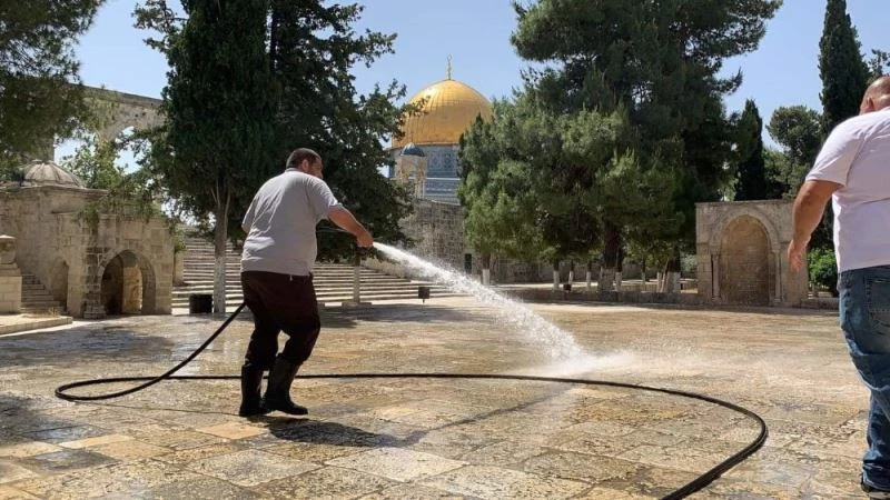 Filistin’de korona virüs salgını kapsamında ibadete kapanan Mescid-i Aksa’da açılması öncesinde sterilizasyon çalışmaları yapıldı.