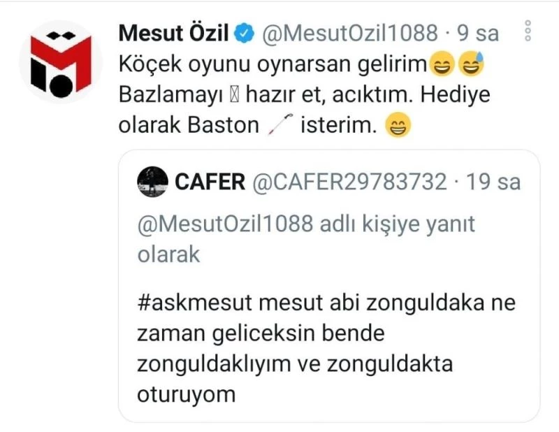 Cafer isimli bir takipçisi tarafından kendisine “Mesut abi Zonguldak’a ne zaman geleceksin? Bende Zonguldaklıyım ve Zonguldak’ta oturuyorum” sorusuna ise ünlü futbolcu “Köçek oyunu oynarsan gelirim. Bazlamayı hazır et acıktım. Hediye olarak baston isterim” dedi.