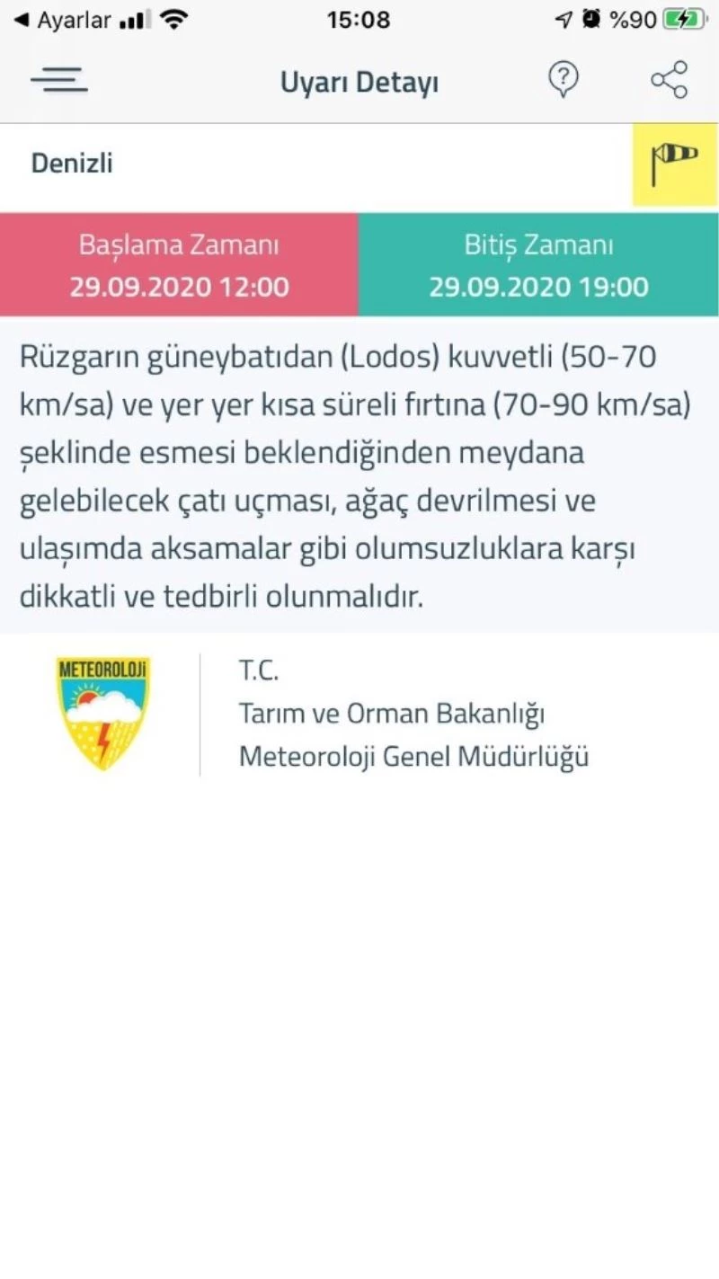 Meteoroloji Genel Müdürlüğü, Denizli, Uşak ve Afyonkarahisar illeri için ‘Sarı Uyarı’da bulunarak vatandaşların tedbirleri olmasını istedi. Yapılan yazılı açıklamada, “Rüzgarın Güneybatıdan (Lodos) saatte 50-70 kilometre hızla ve yer yer kısa süreli saatte 70 ile 90 kilometre hızla fırtına şeklinde esmesi bekleniyor. Meydana gelebilecek çatı uçması, ağaç devrilmesi ve ulaşımda aksamalar gibi olumsuzluklara karşı dikkatli ve tedbirli olunmalı” ifadeleri yer aldı. beklenen fırtınan ise 19.00 sıralarında sona ermesi bekleniyor.