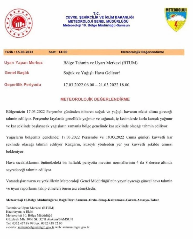 Meteoroloji 10. Bölge Müdürlüğü’nden yapılan son değerlendirmelere göre 17 Mart - 21 Mart arasında Samsun, Ordu, Sinop, Kastamonu, Çorum, Amasya ve Tokat illerini kapsayan uyarıda; perşembeden itibaren soğuk ve yağışlı havanın etkisini göstereceği ifade edildi. Bölge genelinde perşembe ve cuma günü kuvvetli kar yağışlarının olacağı tahmin ediliyor.