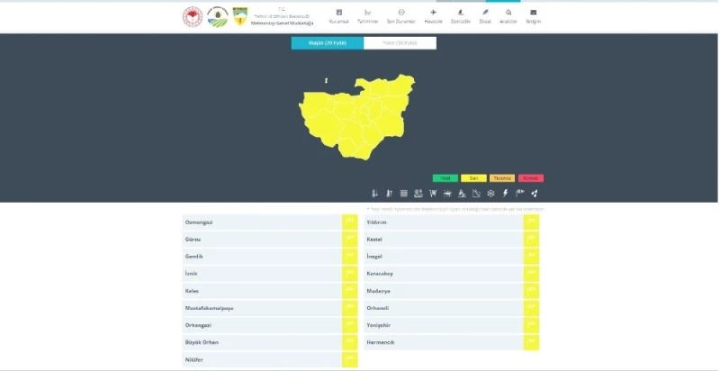 Meteoroloji, Bursa’da kuvvetli yağış beklendiğini açıklayıp bugün 13.00’dan 19.00’a kadar geçerli olmak üzere ’sarı’ uyarı yayımladı.