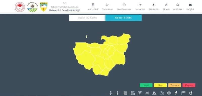 Meteoroloji Genel Müdürlüğü Analiz ve Tahmin Merkezi, 13 Ekim 2020 Salı saat 09.00’dan 21.00’a kadar süreceği tahmin edilen kuvvetli rüzgar uyarısında, "Güney ve güneybatı (lodos) yönlerden kuvvetli rüzgar (40-60 Km/saat), zaman zaman kısa süreli fırtına (70 Km/saat) bekleniyor! Çatı uçması, ağaç ve direk devrilmesi ile ulaşımda aksamalar gibi olumsuzluklara karşı dikkatli ve tedbirli olunmalıdır" ifadelerine yer verildi.