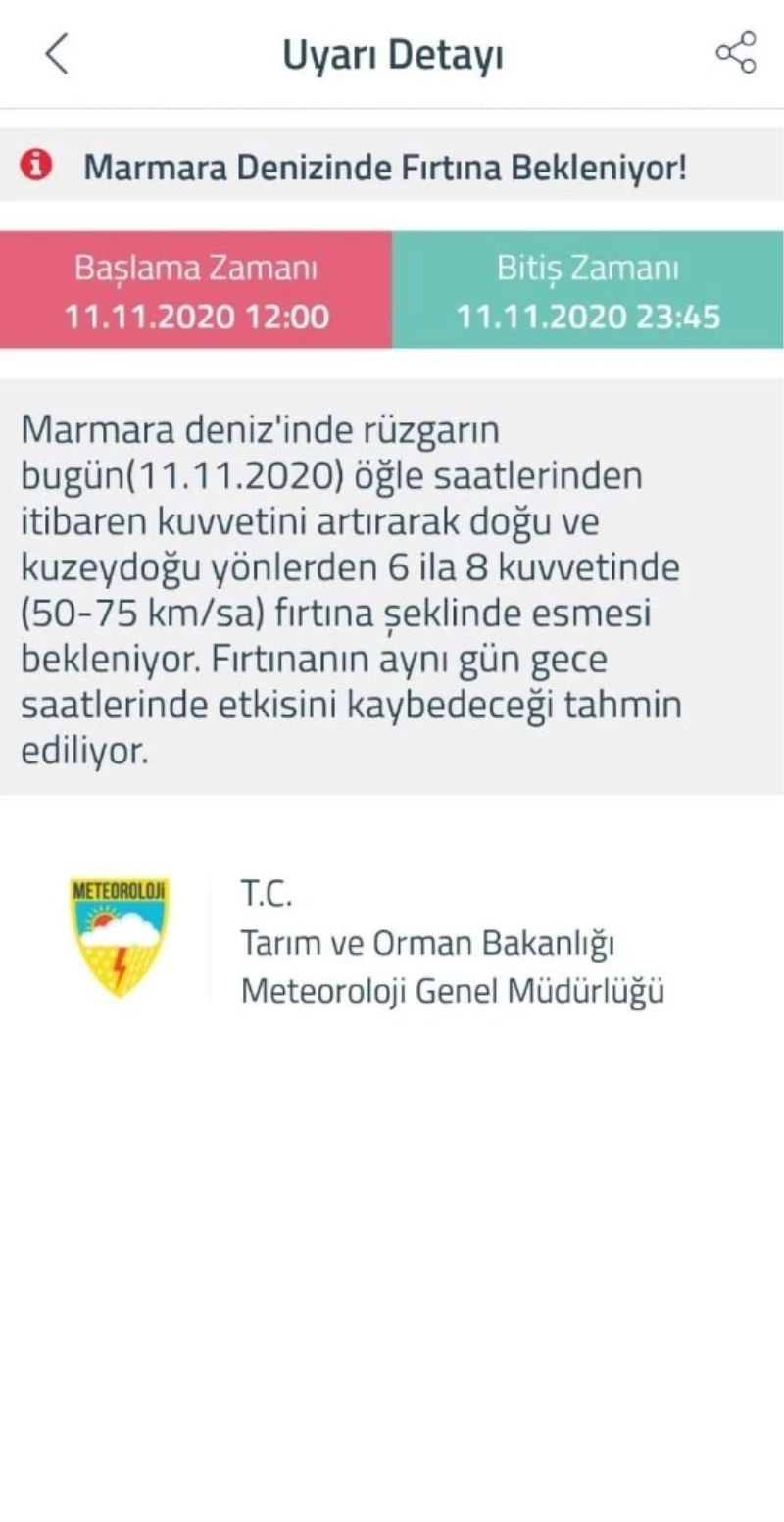 Açıklamada, "Marmara Denizi’nde rüzgarın bugün (11.11.2020) öğle saatlerinden itibaren kuvvetini artırarak doğu ve kuzeydoğu yönlerden 6 ila 8 kuvvetinde (50-75 km/sa) fırtına şeklinde esmesi bekleniyor. Fırtınanın aynı gün gece saatlerinde etkisini kaybedeceği tahmin ediliyor" denilirken, oluşması muhtemel riskler arasında ulaşımda aksamaların oluşması bekleniyor.