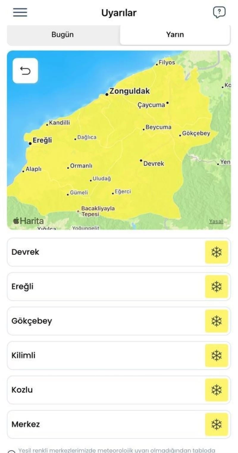 Meteorolojiden yapılan açıklamada Zonguldak’ta 29 Mart günükıyı kesimlerinde kuvvetli yağmur ve karla karışık yağmur, iç kesimlerde kuvvetli karla karışık yağmur ve kar yağışı bekleniyor. Kar kalınlığının 10 ila 20 santimetreyi bulması bekleniyor. Ulaşımda aksamalar, kuvvetli rüzgar ve fırtına, buzlanma ve don olayı, görüş mesafesinde azalma, kıyı kesimlerde su baskını gibi olumsuzluklara karşı dikkatli ve tedbirli olunması gerektiği belirtildi.