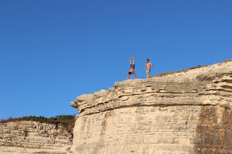 Kocaeli’nin Kandıra ilçesindeki tatil beldelerinde gençler, eğlenmek için tehlikeli bir yöntem seçti. Yaklaşık 25 metre yüksekliğindeki falezlere tırmanan gençler, burada akrobatik hareketler yapmaya başladı. Tehlikeye aldırış etmeyen gençler, bir süre sonra kendilerini metrelerce yükseklikten aşağıya bırakarak Karadeniz’in dalgalı sularına atladı. Bir gencin taklalar atarak kendisini aşağıya bırakmasının ardından başka bir gencin falezlerin en tepesinde amuda kalkması yürekleri ağza getirdi. Amuda kalkan genç, o şekilde kayalıkların ucuna doğru gelerek kendisini derin ve dalgalı sulara bıraktı.
