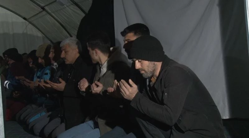 Kahramanmaraş’ta depremzedeler ve görevli personeller, çadır mescitte namaz kılıp dua ederek, Miraç Kandilini idrak etti.
