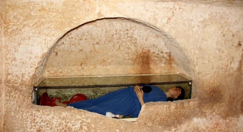 Kommagene Krallığının ‘ölü gömme’ geleneklerinin yansıtıldığı mezar odasında, silikon manken ve iskeletin yanına seramik, takıları ve özel eşyaları bırakıldı. Hazırlanan kaya mezar ziyarete açıldı.