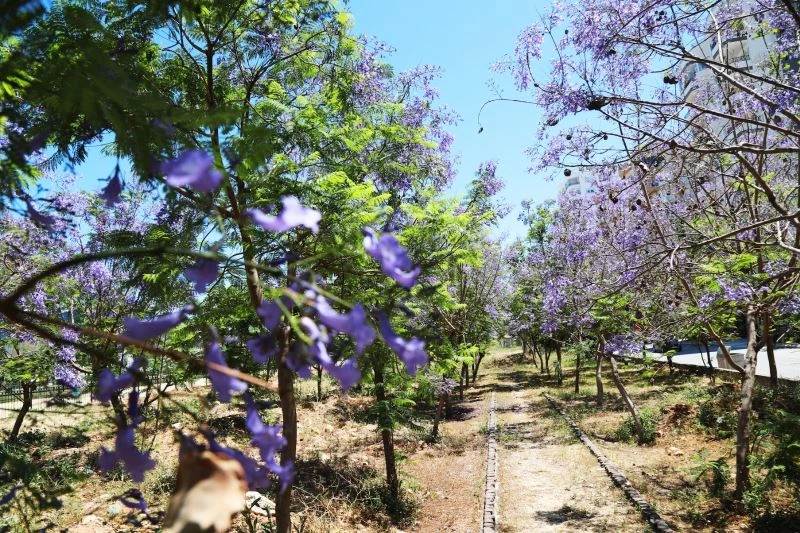 Mezitli Belediyesi tarafından kentin farklı noktalarında oluşturulan 65 koruluktan 55’ine dikilen jakaranda ağaçları, havaların ısınmaya başlamasıyla birlikte yeniden çiçek açtı. Kentin merkezinde yaklaşık 150 dönümlük alanda dikilen binlerce jakaranda mor çiçekleriyle kente hoş kokular içerisinde güzellik ve serinlik katıyor.