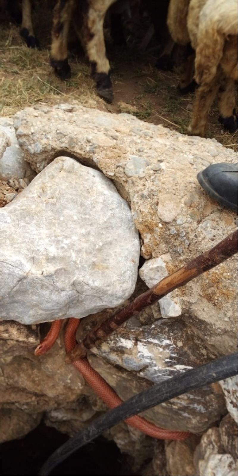 Mezrada hayvanlarını otlatan Mustafa Karakaş, kuyudan su çektiği sırada yaklaşık 2 metre uzunluğunda 2 yılanla karşılaştı. Bu anları cep telefonları ile de kayda alan Karakaş, sosyal medyadan paylaştığı görüntülerde bölgedeki vatandaşları da yılanlara karşı uyardı.