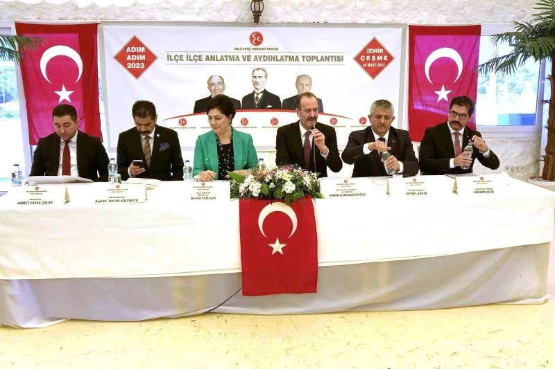 Milliyetçi Hareket Partisi (MHP) Genel Başkanı Devlet Bahçeli’nin talimatıyla tüm Türkiye’de başlatılan “Adım adım 2023, ilçe ilçe anlatma ve aydınlatma toplantıları” İzmir’de tüm hızıyla devam ederken, MHP İzmir Milletvekili Tamer Osmanağaoğlu’nun Çeşme’de başkanlık ettiği toplantıya, İzmir Milletvekili Hasan Kalyoncu, Ankara Milletvekili Nevin Taşlıçay ve MHP Merkez Yönetim Kurulu Üyesi Ahmet Savaş Çolak konuşmacı olarak yer aldı.