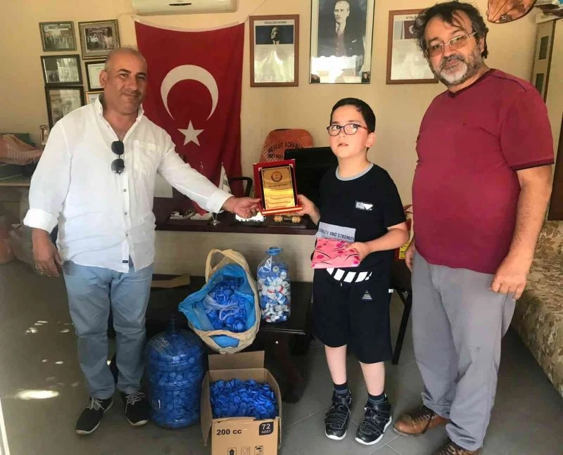 Muğla’nın Milas ilçesinde 9 yaşındaki Mustafa Yiğit Türkmen, engelliler için topladığı mavi kapakların teslimatını yaptı.