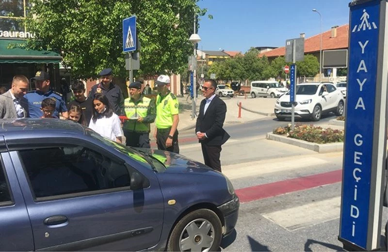 Kaymakam Böke sürücülere uyarılarda bulunup kısa süreli sohbet ederken, öğrenciler ise araçta bulunan çocuklara düdük hediye ederek, içerisinde bulundukları araçların sürücülerinin hata yapması durumunda düdüğü çalarak uyarıda bulunmalarını istediler.