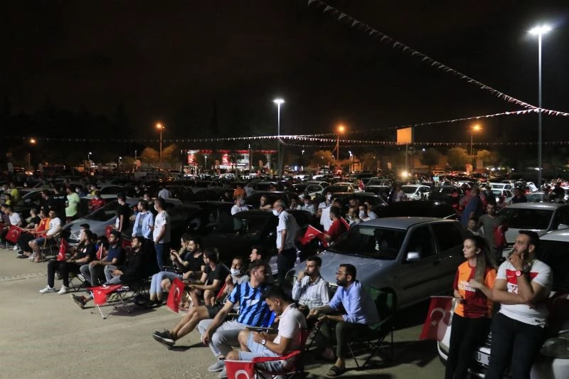 Euro 2020 Türkiye-İtalya maçını, Adanalı vatandaşlar millet bahçesi içerisinde kurulan dev ekran ile araçlarında izleme imkanı buldu.