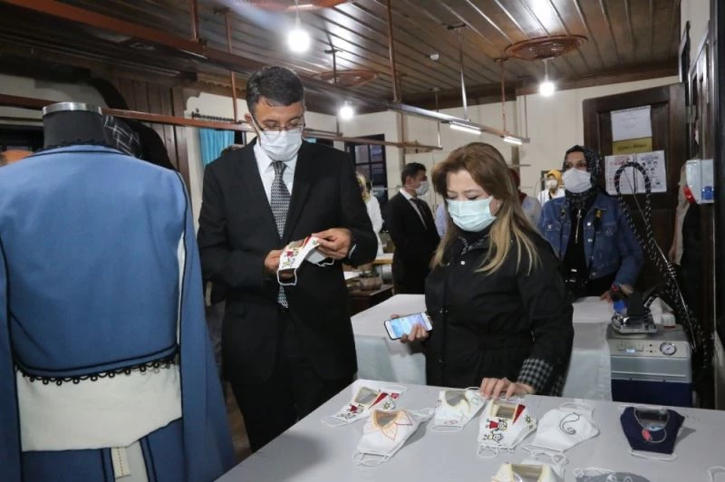 Kültürel mirası yaşatmak ve gelecek nesillere aktarmak amacıyla kurulan enstitüde dikiş, nakış, çini atölyelerini gezen Milletvekili Erenler ve Vali Çelik, atölyeler, kurslar ve maske üretimi konusunda Enstitü Müdürü Elif Telli’den bilgiler aldı.