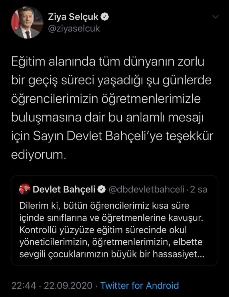 Bakan Selçuk, sosyal medya hesabından MHP Genel Başkanı Devlet Bahçeli’ye teşekkür etti. Bakan Selçuk, Bahçeli’nin tweetini alıntılayarak, “Eğitim alanında tüm dünyanın zorlu bir geçiş süreci yaşadığı şu günlerde öğrencilerimizin öğretmenlerimizle buluşmasına dair bu anlamlı mesajı için Sayın Devlet Bahçeli’ye teşekkür ediyorum” ifadelerini kullandı.
