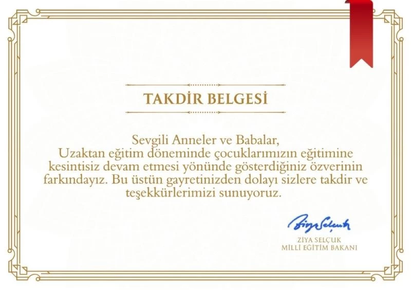 Milli Eğitim Bakanlığı, sosyal paylaşım sitesi Twitter üzerinden veliler için hazırlanan ’Takdir Belgesi’ni paylaştı. Milli Eğitim Bakanı Ziya Selçuk’un imzasının yer aldığı söz konusu belgede şu ifadeler yer aldı: