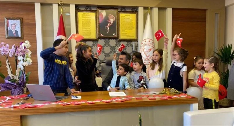Çocukların 23 Nisan Ulusal Egemenlik ve Çocuk Bayramı'nı kutlayan Çalışkan, öğrencilerle makam odasını bayraklar ve balonlarla süsledi.