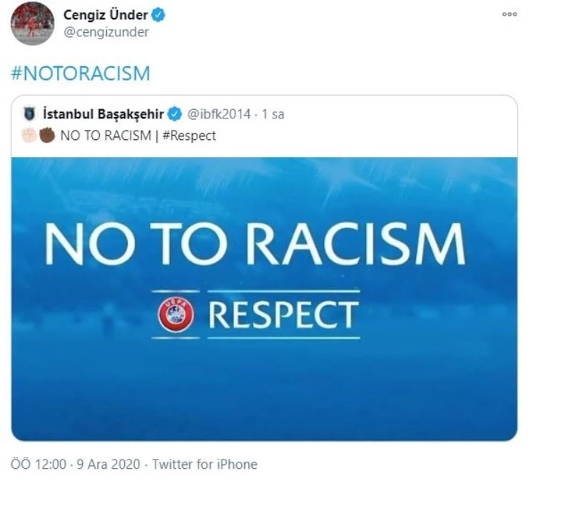 UEFA Şampiyonlar Ligi 6. haftasında Medipol Başakşehir’in deplasmanda oynadığı Paris Saint Germain müsabakasında maçın 4. hakemi Sebastian Coltescu, Başakşehir Yardımcı Antrenörü Pierre Webo’ya ırkçı söylemde bulundu. Yaşanan olayın ardından müsabaka askıya alınırken, milli futbolcular da sosyal medyadan Pierre Webo’ya destek mesajları gönderdi. Fransa’nın Lille takımında forma giyen Yusuf Yazıcı ‘No To Racism’ notu ile paylaşım yaparken, Mehmet Zeki Çelik ise saygı anlamına gelen ‘Respect’ kelimesi ile Başakşehir’e destek oldu. İngiltere Premier Lig ekiplerinden Leicester City’de forma giyen Çağlar Söyüncü ise ‘Webo. No To Racism’ diyerek desteğini dile getirirken, bir diğer milli oyuncu Cengiz Ünder de ‘No To Racism’ ifadelerine yer verdi. Juventus’ta forma giyen Merih Demiral da ’No To Racism. Respect’ açıklamasını yaptı.