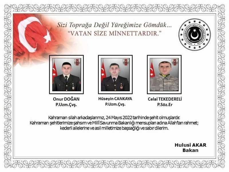 “Kahraman silah arkadaşlarımız, 24 Mayıs 2022 tarihinde şehit olmuşlardır. Kahraman şehitlerimize şahsım ve Milli Savunma Bakanlığı mensupları adına Allah’tan rahmet; kederli ailelerine ve asil milletimize başsağlığı ve sabır dilerim.”
